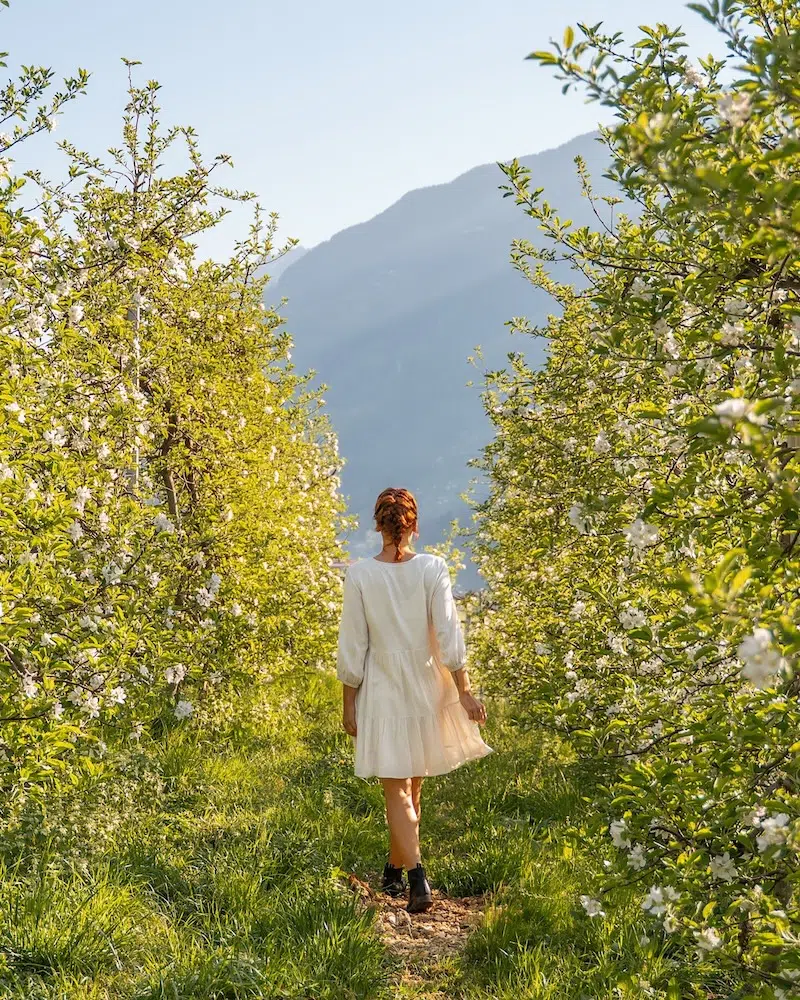 Zu den schönsten Reisezeiten zählt für mich der Frühling, denn wenn an anderen Orten Südtirols der Skitourismus noch auf Hochtouren läuft, kommen im Meraner Land schon die ersten Frühlingsgefühle auf. Du kannst bereits bei milden Temperaturen wandern und die mediterrane Vegetation bestaunen. Ein echtes Highlight ist die Apfelblüte Ende April, denn dann verwandelt sich das gesamte Meraner Land in ein Meer aus weißen Blüten.