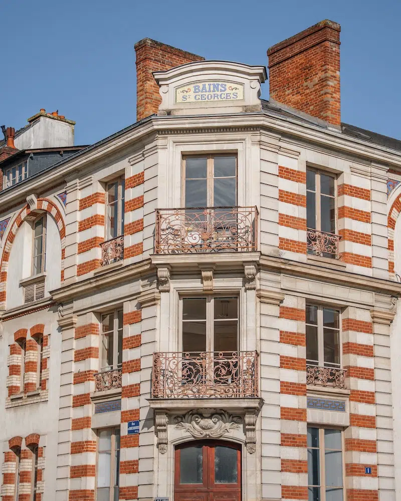 Nur wenige Schritte vom Hallenbad entfernt, befindet sich mit den Bains Saint Georges eines der fotogensten Gebäude von Rennes. Der Bau aus den 1920er Jahren gehört zum historischen Badekomplex Saint Georges und fällt sofort durch seine markante Ecklage sowie die roten Backsteine mit hellen Steinrahmen auf.